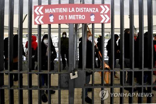 epa08957810 People wait at the anti Covid vaccination center set up at the Mostra d'Oltremare in Naples, Italy, 22 January 2021. The cut in the supply of vaccines disrupted the vaccination campaign in Italy allowing less people to get the second booster injection. Pfizer pledged to resume full supplies of the covid19 vaccine to all EU countries as of next week. EPA/CIRO FUSCO
