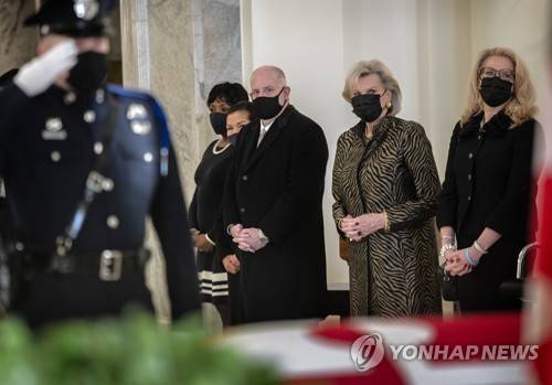 Gov. Larry Hogan, center, with wife Yumi, left, stands with family members of the late Senate President Emeritus Thomas V. Mike Miller, Jr., under the dome of the statehouse at the Maryland Statehouse in Annapolis, Md., on Friday, Jan. 22, 2021. Miller was a state legislator for 50 years. A Democrat, he served as president of the Maryland Senate for 33 years. He announced he was stepping down from the post in 2019, but he remained a senator until December. (Bill O'Leary/The Washington Post via AP, Pool) POOL PHOTO; MANDATORY CREDIT