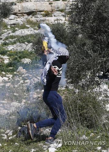 epa08957828 A Palestinian protester throws back a tear gas grenade at Israeli troops during clashes after a demonstration against Israel's settlements in the village of Kofr Qadom, near the northern West Bank city of Nablus, 22 January 2021. According to reports, 18 Palestinians were wounded by tear gas and rubber bullets. EPA/ALAA BADARNEH