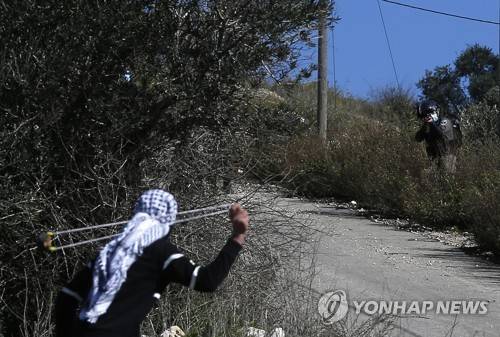 epa08957831 A Palestinian protester uses a sling shot to throw stones at Israeli troops during clashes after a demonstration against Israel's settlements in the village of Kofr Qadom, near the northern West Bank city of Nablus, 22 January 2021. According to reports, 18 Palestinians were wounded by tear gas and rubber bullets. EPA/ALAA BADARNEH