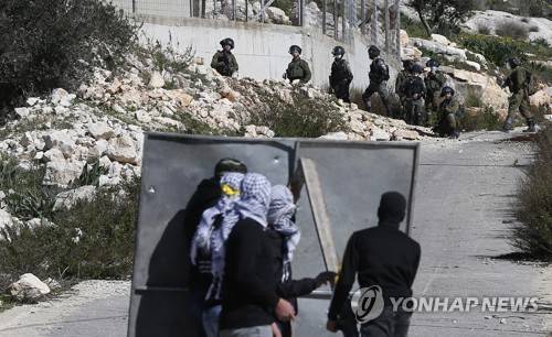 epa08957835 Palestinian protesters throw stones at Israeli troops during clashes after a demonstration against Israel's settlements in the village of Kofr Qadom, near the northern West Bank city of Nablus, 22 January 2021. According to reports, 18 Palestinians were wounded by tear gas and rubber bullets. EPA/ALAA BADARNEH
