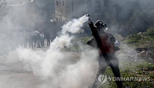 epa08957842 A Palestinian protester throws back a tear gas grenade at Israeli troops during clashes after a demonstration against Israel's settlements in the village of Kofr Qadom, near the northern West Bank city of Nablus, 22 January 2021. According to reports, 18 Palestinians were wounded by tear gas and rubber bullets. EPA/ALAA BADARNEH