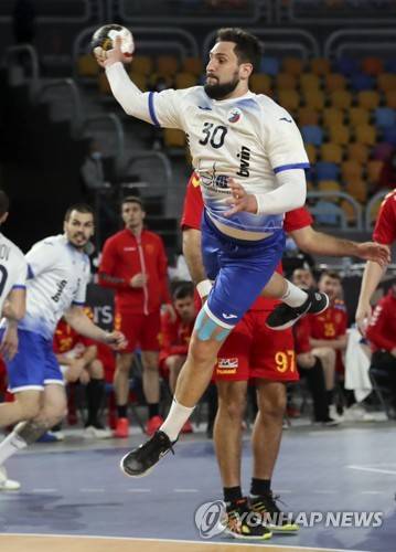 epa08957859 Aleksandr Ermakov of Russia in action during the Main Round match between North Macedonia and Russia at the 27th Men's Handball World Championship in Cairo, Egypt, 22 January 2021. EPA/Mohamed Abd El Ghany / POOL