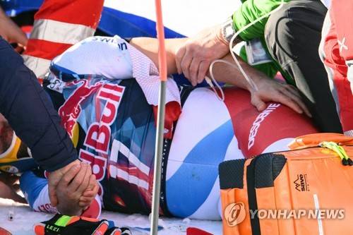 epa08957893 Medics tend to Urs Kryenbuehl of Switzerland after Kryenbuehl crashed during the FIS Alpine Skiing World Cup event in Kitzbuehel, Austria, 22 January 2021. EPA/CHRISTIAN BRUNA
