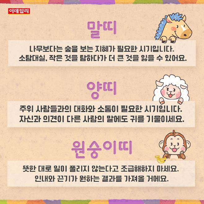 73년생 - 다른 사람과의 동업이나 금전 거래는 피하세요. 자칫 혼자 고생하고 남 좋은 일만 할 수 있어요.