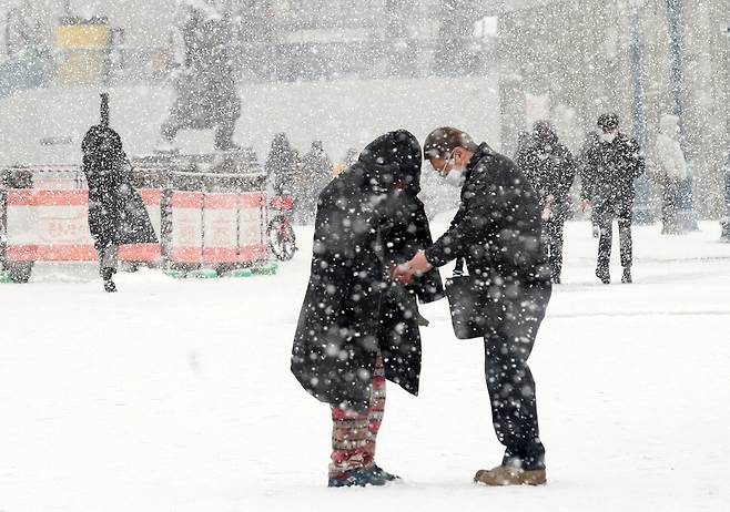 소낙눈이 무섭게 쏟아지던 18일 오전 서울역 앞 광장에서 얇은 군용 내피와 수면용 바지에 의존해 겨울을 나던 노숙인에게 지나가던 시민이 자신이 입고 있던 방한용 외투와 장갑 그리고 지갑 속 5만원을 건네고 있다. 노숙인은 “너무 추워서 따뜻한 커피 한 잔만 사달라고 했는데 아무런 대꾸도 없이 내 어깨를 잡더니 입고 있던 외투와 장갑을 줘 너무 고맙고 눈물이 난다”고 했다. 이 시민은 인터뷰할 틈도 없이 빠른 걸음으로 사라졌다. 백소아 기자 thanks@hani.co.kr