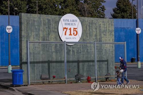 epa08958661 Atlanta Braves fan Les Motes and his daughter Mahalia, 2, leave flowers, a baseball and a balloon at the location where Atlanta Braves baseball legend Henry 'Hank' Aaron's record-breaking 715th career home run went over the outfield fence at the former Fulton County Stadium in Atanta, Georgia, USA, 22 January 2021. Hank Aaron has died at the age of 86, it was reported 22 January 2021 EPA/ERIK S. LESSER