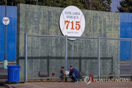epa08958669 Atlanta Braves fan Les Motes and his daughter Mahalia, 2, leave flowers, a baseball and a balloon at the location where Atlanta Braves baseball legend Henry 'Hank' Aaron's record-breaking 715th career home run went over the outfield fence at the former Fulton County Stadium in Atanta, Georgia, USA, 22 January 2021. Hank Aaron has died at the age of 86, it was reported 22 January 2021 EPA/ERIK S. LESSER