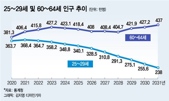 노원구청 사례가 대표적이다. 지난해 전국민주노동조합총연맹(민주노총) 소속 노원서비스공단 분회는 미화, 주차, 경비 요원 등의 정년을 60세에서 65세로 높여 달라며 노원구 청사를 점거했다. 이 같은 노사 갈등은 빠른 속도로 증가하고 있는 고령 인구를 고려하면 앞으로 곳곳에서 번질 가능성이 크다. 이미 우리 사회는 지난해 인구 데드크로스를 기록, 인구가 감소하는 시기로 접어들었다.