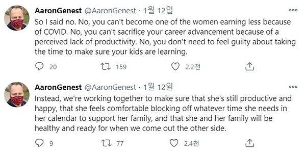 제네스트 씨는 "팀원 중 누군가가 잠시 아이를 돌봐야 한다면 다른 누군가가 기꺼이 도울 것이다. 화상 회의에 두 살배기 아기가 불쑥 등장해도 모두가 웃으며 이해할 것"이라면서 "그래서 나는 당신의 부탁을 들어줄 수가 없다. 당신이 코로나19로 임금 삭감을 겪는 여성이 되도록 놔둘 수 없다. 당신이 죄책감 때문에 승진 기회를 포기하도록 놔둘 수 없다"고 말했습니다.