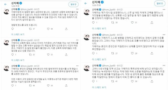 신 대표는 또 “본인의 감형을 위해 어린 딸에게까지 탄원서를 쓰게 했다”며 “50대 아버지가 ‘준강간’ ‘치상’이 무엇인지도 모를 초등학생 딸에게 탕원서를 요청한 것이다. 이런 사람이 고작 감옥에 3년 6개월 살고 아동청소년기관 취업이 3년만 제한된다는 사실이 끔찍하다”고 했다.