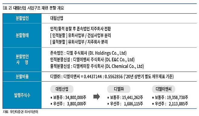 DL이앤씨는 기존 대림산업의 별도 기준 건설부문과 대림건설(보통주 지분 63.9 %), 해외법인(사우디 , 터키)을 포함한다 . DL은 물적분할 DL케미칼(지분 100%)을 비롯해 건설 부문을 제외한 기존 대림산업 기타 자회사(글래드호텔, Cariflex 등)의 지주사 역할을 한다. 기존 대림산업의 지분법 회사였던 여천NCC와 폴리미래는 DL케미칼 아래 위치하게 된다.