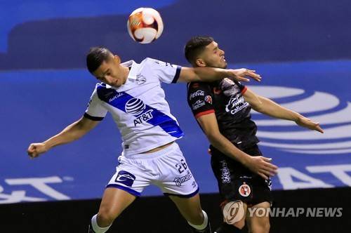 epa08959093 Salvador Reyes (L) of Puebla in action against David Barbona (R) of Club Tijuana during a Liga MX day three Clausura Tournament soccer match between Puebla and Club Tijuana at the Cuauhtemoc Stadium in Puebla, Mexico, 22 January 2021. EPA/Hilda Rios