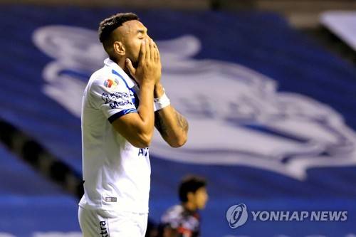 epa08959094 Emanuel Gularte of Puebla gestures during a Liga MX day three Clausura Tournament soccer match between Puebla and Club Tijuana at the Cuauhtemoc Stadium in Puebla, Mexico, 22 January 2021. EPA/Hilda Rios