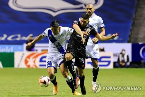 epa08959095 Salvador Reyes (L) of Puebla in action against David Barbona (C) of Club Tijuana during a Liga MX day three Clausura Tournament soccer match between Puebla and Club Tijuana at the Cuauhtemoc Stadium in Puebla, Mexico, 22 January 2021. EPA/Hilda Rios