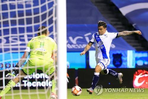 epa08959096 Christian Tabo (R) of Puebla attempts to score against Club Tijuana goalkeeper Jonathan Orozco (L) during a Liga MX day three Clausura Tournament soccer match between Puebla and Club Tijuana at the Cuauhtemoc Stadium in Puebla, Mexico, 22 January 2021. EPA/Hilda Rios
