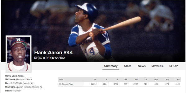 행크 아론은 미국 야구의 아이콘이자 조지아 주의 전설이었다. '25회 올스타' , ' NL 타격왕' , '최대 안타·홈런·타점왕' 등 그의 행보들은 새로운 역사를 만들었다.