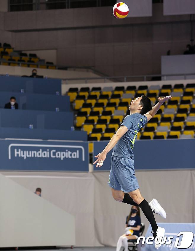 (서울=뉴스1) = 23일 충남 천안 유관순체육관에서 열린 도드람 2020-2021 V-리그 현대캐피탈과 KB손해보험의 경기에서 현대캐피탈 최민호가 서브를 넣고 있다. (현대캐피탈 배구단 제공) 2021.1.23/뉴스1
