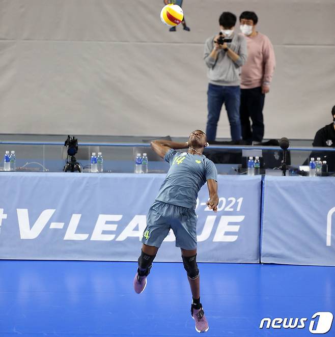 (서울=뉴스1) = 23일 충남 천안 유관순체육관에서 열린 도드람 2020-2021 V-리그 현대캐피탈과 KB손해보험의 경기에서 현대캐피탈 다우디가 서브를 넣고 있다. (현대캐피탈 배구단 제공) 2021.1.23/뉴스1