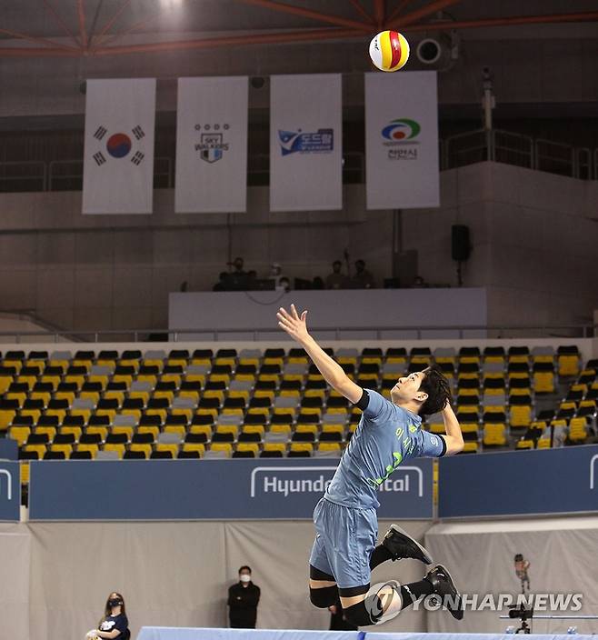 (서울=연합뉴스) 23일 오후 충남 천안 유관순체육관에서 열린 2020-2021 프로배구 V리그 현대캐피탈과 KB손해보험의 경기에서 현대캐피탈 이시우가 서브를 하고 있다. 2021.1.23 [현대캐피탈 배구단 제공. 재판매 및 DB 금지]