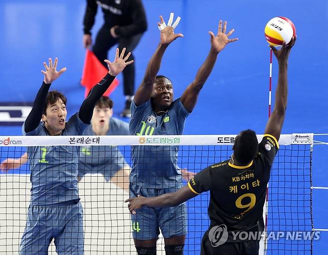 (서울=연합뉴스) 23일 오후 충남 천안 유관순체육관에서 열린 2020-2021 프로배구 V리그 현대캐피탈과 KB손해보험의 경기에서 현대캐피탈 차영석과 다우디가 블로킹을 하고 있다. 2021.1.23 [현대캐피탈 배구단 제공. 재판매 및 DB 금지]