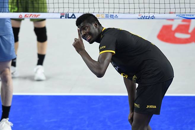 (서울=연합뉴스) 23일 충남 천안 유관순체육관에서 열린 2020-2021 프로배구 남자부 현대캐피탈과 KB손해보험의 경기에서 KB손해보험 케이타가 동료선수들과 사인을 주고받고 있다. 2021.1.23 [한국배구연맹 제공. 재판매 및 DB 금지]