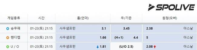 따라서 스포라이브의 배당률과 아스널과 사우샘프턴의 최근 맞대결 전적(아스널 2승 2무 1패)을 고려해, 아스널의 1-0 승리를 예상한다.
