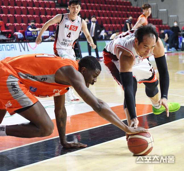 인천 전자랜드의 심스가 23일 인천 삼산체육관에서 진행된 kt와의 경기에서 김영환과 루스볼을 다투고있다. 2021.01.23. 김도훈기자 dica@sportsseoul.com