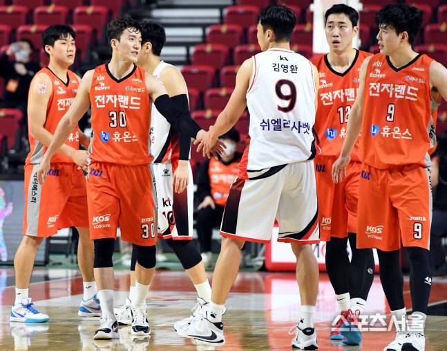 인천 전자랜드의 박찬희가 23일 인천 삼산체육관에서 진행된 kt와의 경기에서 79-96으로 패한 뒤 김영환과 인사하고있다. 2021.01.23. 김도훈기자 dica@sportsseoul.com