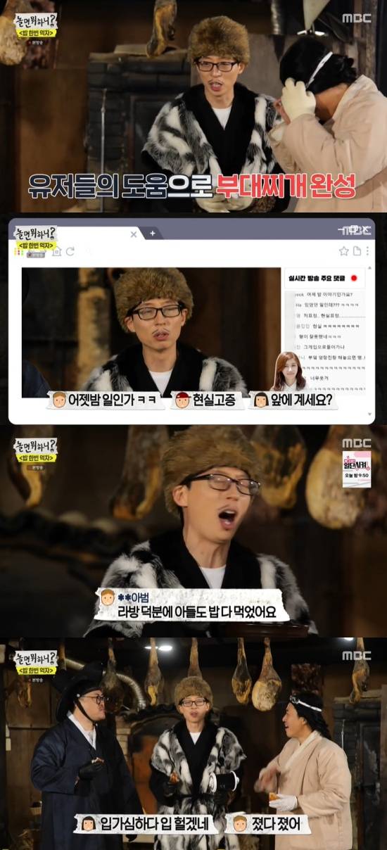 더 나아가 차돌박이, 솥뚜껑 위에서 만든 계란 프라이 등 군침이 도는 '먹방'이 이어졌다. 한 시청자는 "라방 덕분에 우리 아들도 밥 다 먹었다"라며 말했고, 유재석은 육아 고충을 공감하며 함께 기뻐했다.
