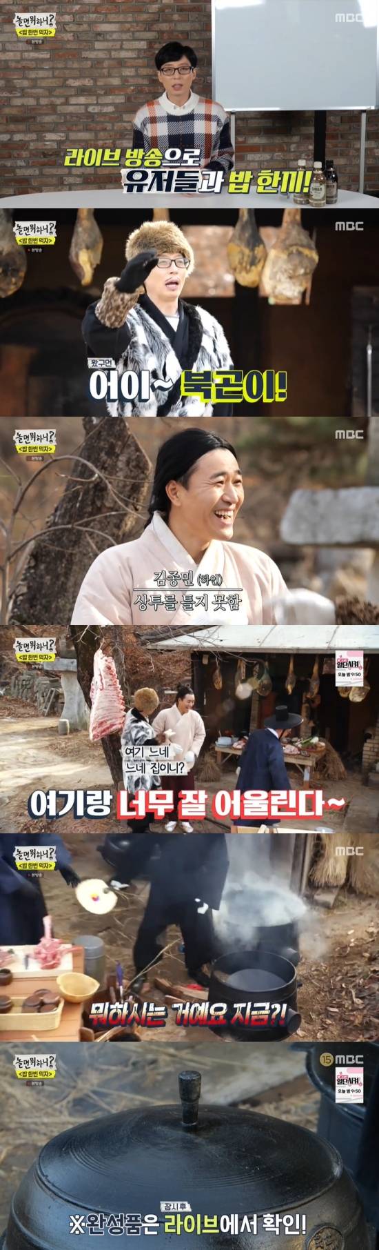 유재석, 데프콘, 김종민은 초가집 마당에서 고기를 구워 먹기로 했다. 세 살마은 가마솥 밥과 토마호크, 부대찌개 등 여러 가지 음식을 준비했다. 그러나 장작을 패는 과정부터 실수를 연발했고, 재료를 손질하고 요리를 만들며 서툰 모습으로 웃음을 자아냈다.
