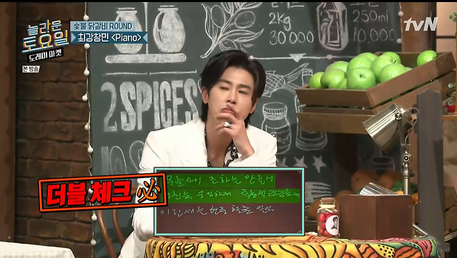 유노윤호에 크게 감화한 김동현은 받아쓰기판에 윤호의 명언을 적어내려 웃음을 안겼다. 앞서 최강창민 출연 당시 윤호의 음악이 문제로 등장했던데 이어, 이날은 최강창민이 지난해 4월에 발표한 '피아노'가 출제됐다.