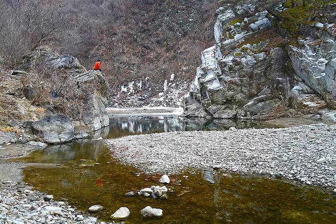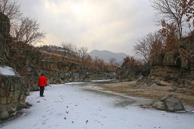 편편했던 하천 바닥을 절단한 것처럼 푹 내려앉은 곳이 나왔다. 하천이 흘렀다면 작은 폭포를 이루면서 낮게 흘러가는 지형일 것이다. 바닥으로 내려서니 강 절벽이 성벽처럼 높아졌다. 이곳엔 바닥에 물이 있는 곳에는 얼음이 얼어 있다. 건치천은 살짝 방향을 틀어 계속 아래쪽으로 이어졌다. 작은 하천에 이렇게 다양한 모습이 숨어 있을 줄은 몰랐다. 높은 곳에서 협곡을 내려다 보는 것과 협곡 안에 들어와 있는 것은 이렇듯 달랐다.