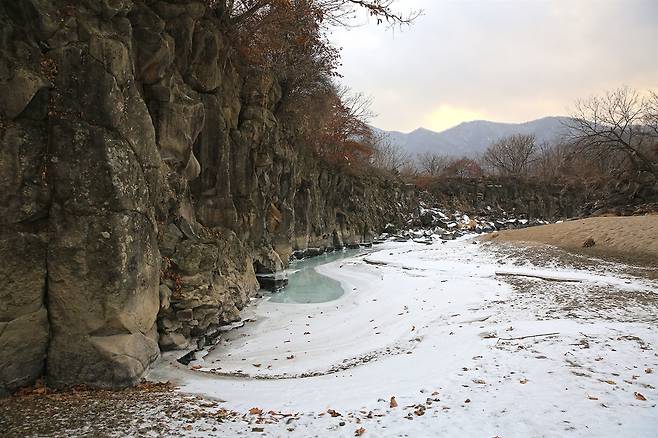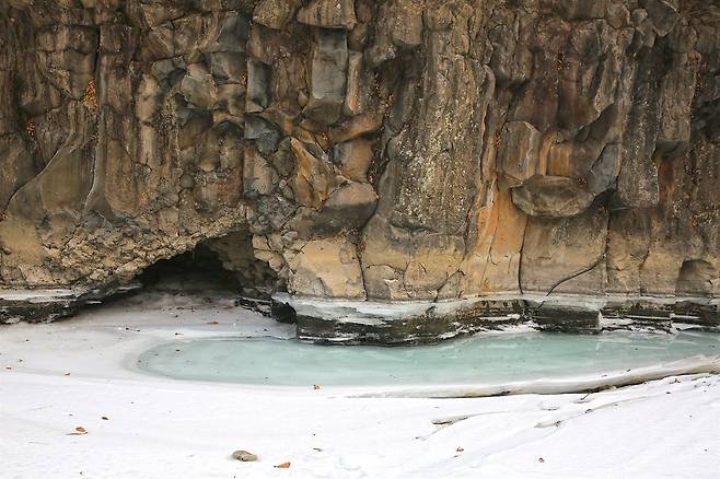 절리 아래쪽에 형성된 동굴의 아치형 입구는 미처 암석화되지 않은 퇴적층으로 보였다. 주상절리 제일 아래쪽 암석은 물이 흐르기 전에 형성된 원래의 퇴적층일 것이다. 물결처럼 고운 층을 이루고 있다. 얼어 붙은 강바닥은 투명한 옥빛 대리석이라도 깔아 놓은 듯했다. 멀리서 보니 마치 해저 왕궁의 입구같다. 정말로 안쪽에 거대한 동굴이 있는 것은 아닐지…
