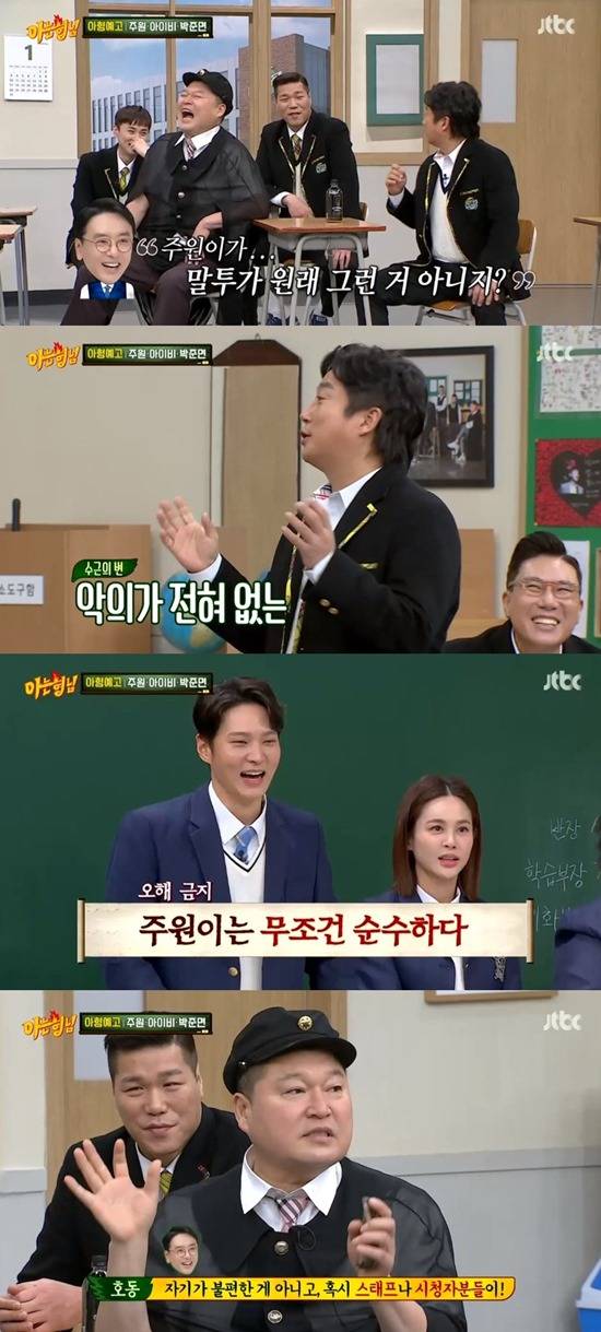 김승우의 말을 전한 이수근은 "그렇게 말했더니 주원이가 '응. 알았어'라고 했다"라며 반말을 고치지 못 한 주원을 밝혔다. 강호동은 "김승우도 다 괜찮은데 주변 사람들의 오해를 걱정해서 그랬다"라고 덧붙였다.