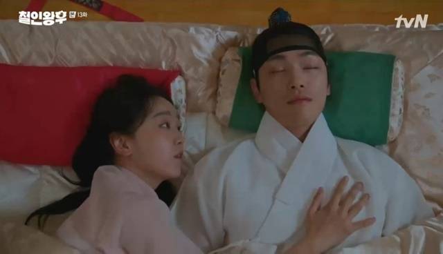 김소용은 철종이 의식을 찾았다는 소식에 찾아갈 용기가 나지 않아 술에 만취했다가 그대로 잠들었고, 잠결에 몸종 홍연(채서은 분)과 키스했다. 하지만 다음 날 아침 김소용의 곁에는 철종이 누워 있었다. (사진=tvN ‘철인왕후’ 캡처)