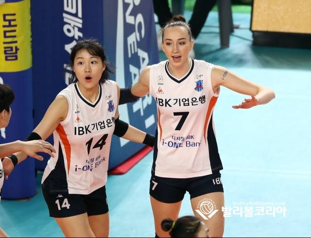 【발리볼코리아닷컴(김천)=김경수 기자】 23일(토) 경북 김천시 김천실내체육관에서 열린 프로배구 2020-2021 V리그 4라운드 여자부 한국도로공사 vs IBK기업은행 김천경기에서 IBK기업은행 조송화와 라자레바가 공격을 성공시키고 기뻐하고 있다. 2021. 1.23.