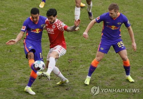 epa08959967 Leipzig's Tyler Adams (L) in action against Mainz?s Danny Latza (C) during the German Bundesliga soccer match between FSV Mainz 05 and RB Leipzig in Mainz, Germany, 23 January 2021. EPA/RONALD WITTEK CONDITIONS - ATTENTION: The DFL regulations prohibit any use of photographs as image sequences and/or quasi-video.