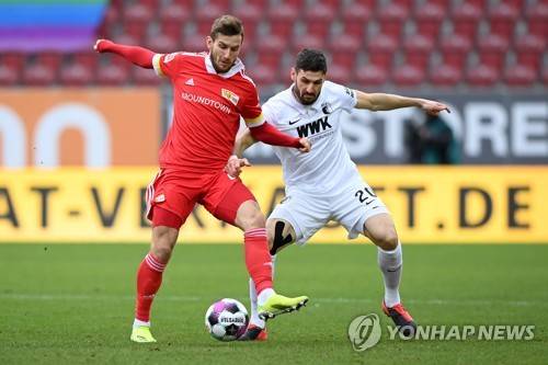 epa08960002 Christopher Lenz of 1. FC Union Berlin (L) is challenged by Daniel Caligiuri of Augsburg during the Bundesliga match between FC Augsburg and 1. FC Union Berlin at WWK-Arena in Augsburg, Germany, 23 January 2021. EPA/SEBASTIAN WIDMANN / POOL DFL regulations prohibit any use of photographs as image sequences and/or quasi-video.