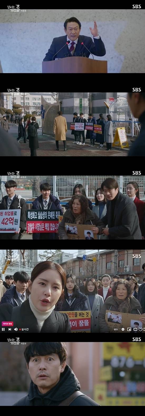 강철우는 대통령선거 출마선언을 했다. 같은 시각 구혜영, 전다영은 학교 정문 앞에서 시위를 시작했고, 다른 학생들은 취업증명서를 떼러 학교에 왔다. 앞에서 지켜보고 있던 박삼수는 김귀현(이순원)에게 승운재단을 고발하는 기사를 전송하라고 밝혔다. 이어 이유경은 승운재단 비리를 고발하는 방송을 시작했다. 허성윤은 학교 문을 닫으라고 지시했지만, 박태용과 다른 학생들은 반발했다.