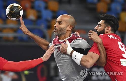 epa08960026 Bahrains Mohamed Ahmed (R) in action against Qatar's Mahmoud Hassaballa (L) during the Main Round match between Qatar and Bahrain at the 27th Men's Handball World Championship in Cairo, Egypt, 23 January 2021. EPA/Anne-Christine Poujoulat / POOL