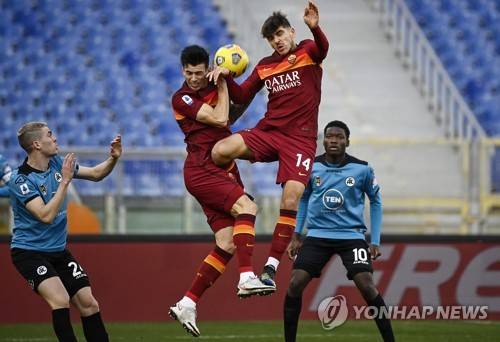epa08960027 Romas Gonzalo Villar (R) and Roger Ibanez (L) in action during the Serie A soccer match between AS Roma and Spezia Calcio at the Olimpico stadium in Rome, Italy, 23 January 2021. A EPA/RICCARDO ANTIMIANI