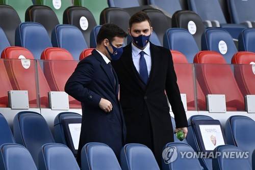 epa08960036 AS Romas General Manager Tiago Pinto (L) with AS Roma's Vice-President Ryan Friedkin (R) on the stands during the Serie A soccer match between AS Roma and Spezia Calcio at the Olimpico stadium in Rome, Italy, 23 January 2021. A EPA/RICCARDO ANTIMIANI