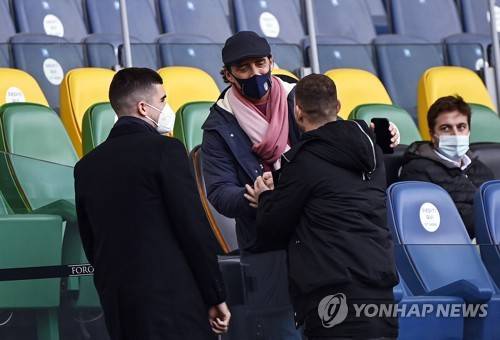 epa08960040 Italys head coach Roberto Mancini (C) with AS Roma''s Edin Dzeko (R) and Gianluca Mancini (L) on the stands during the Serie A soccer match between AS Roma and Spezia Calcio at the Olimpico stadium in Rome, Italy, 23 January 2021. A EPA/RICCARDO ANTIMIANI