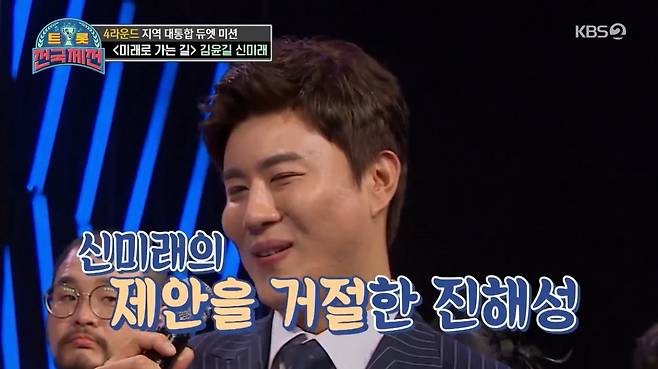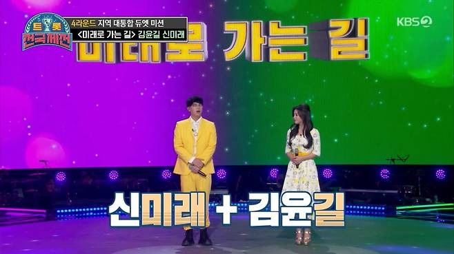 이날 강원 신미래-글로벌 김윤길이 뭉친 '미래로 가는 길' 팀은 결성 이야기부터 주목을 받았다. 앞서 신미래가 진해성을 지목했으나 거절 당해 듀엣이 성사되지 못했고, 끝까지 남아있던 두 사람이 팀이 된 것.