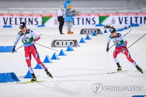 epa08960052 Jarl Magnus Riiber of Norway (L) and Jens Luraa Oftebro of Norway (R) in action during the Team Sprint LH/2x7.5km sprint portion at the men's FIS Nordic Combined World Cup in Lahti, Finland, 23 January 2021. EPA/KIMMO BRANDT