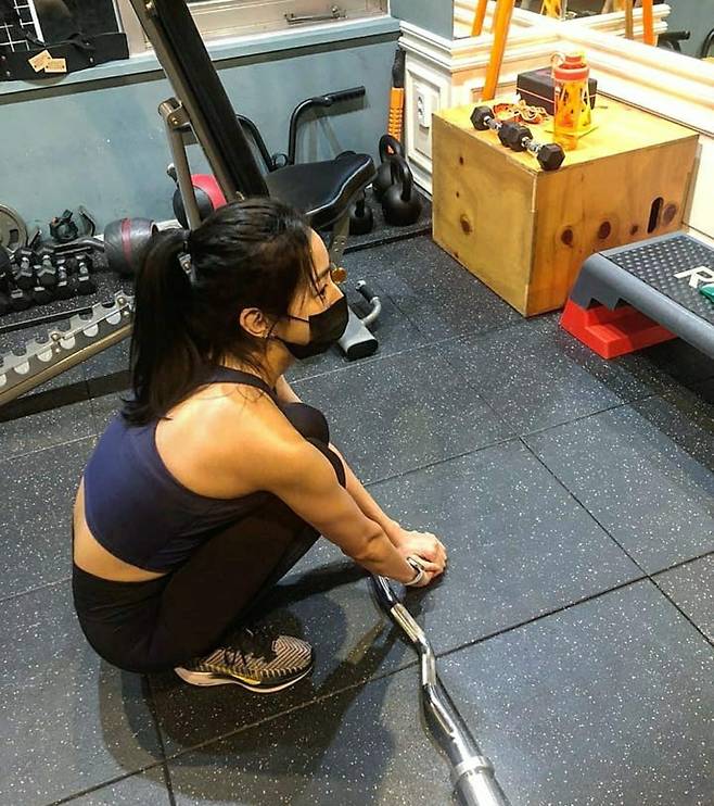 공개된 사진 속 유이는 헬스장에서 마스크를 착용한 채 운동에 힘을 쏟고 있는 모습.