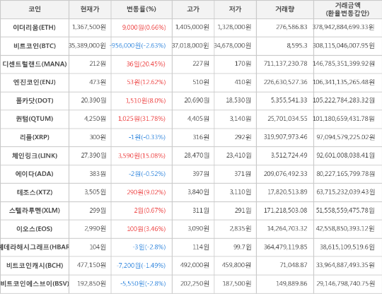 또한, 디센트럴랜드(20.45%, 212원), 체인링크(15.08%, 27,390원), 엔진코인(12.62%, 473원), 테조스(9.02%, 3,505원), 폴카닷(8.0%, 20,390원), 이오스(3.46%, 2,990원), 스텔라루멘(0.67%, 299원), 이더리움(0.66%, 1,367,500원)이 상승세를 나타냈다.