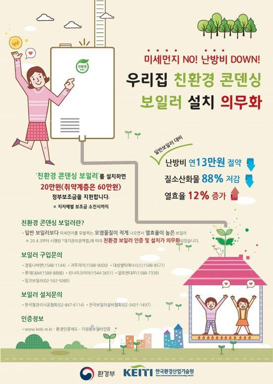 친환경 보일러는 질소산화물(NOx) 배출농도가 20ppm 이하 에너지 소비효율 92% 이상 기준 등을 충족, 한국환경산업기술원의 환경표지 인증을 받은 제품을 말한다. 이러한 보일러는 일반 보일러에 비해 초미세먼지 원인물질인 질소산화물 배출이 8분의 1 수준이며, 열효율이 높아 연간 약 13만 원의 연료비 절감효과가 있다.