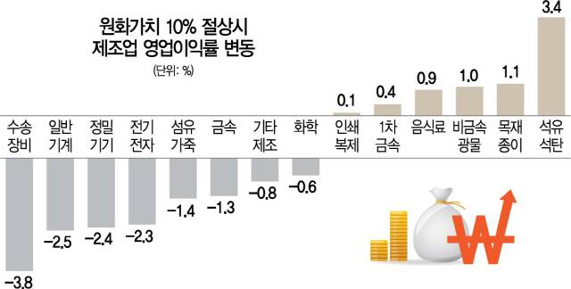 문제는 달러 약세뿐 아니라 최근 무역 수지가 개선되면서 원화 강세 요인도 나타나고 있다는 것이다. 원화 가치가 절상되는 과정에서 원·달러 환율이 하향 안정화되면 일부 산업의 채산성이 떨어질 수 있다는 지적이다. 연구원은 원화 가치가 10% 절상될 경우 수송 장비 산업의 영업이익률은 3.8% 떨어질 것으로 봤다. 일반기계(-2.5%), 정밀기기(-2.4%), 전기·전자(-2.3%) 등도 원화 절상으로 영업이익에 타격을 받는다.